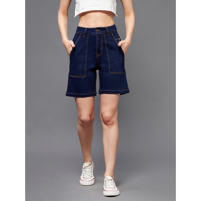 Navy Blue Regular High rise Clean look Above Knee Stretchable Denim Shorts. It has a button and zip fly closure. It has coin, patch and welt pockets.Color: Navy BlueMaterial Composition: 71.4% Cotton 26.6% Polyester 2% ElastaneFabric: DenimLength: Above Kn